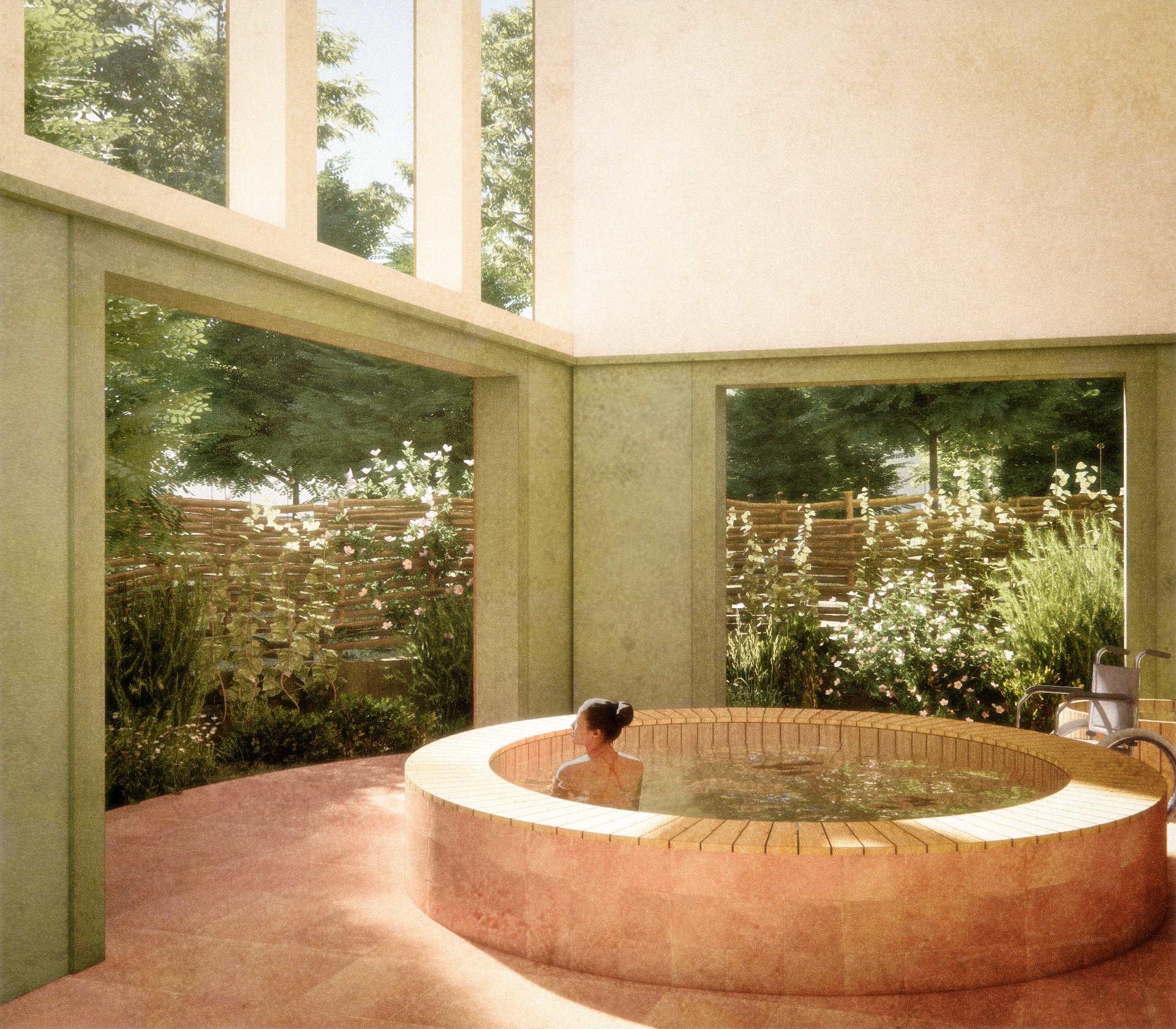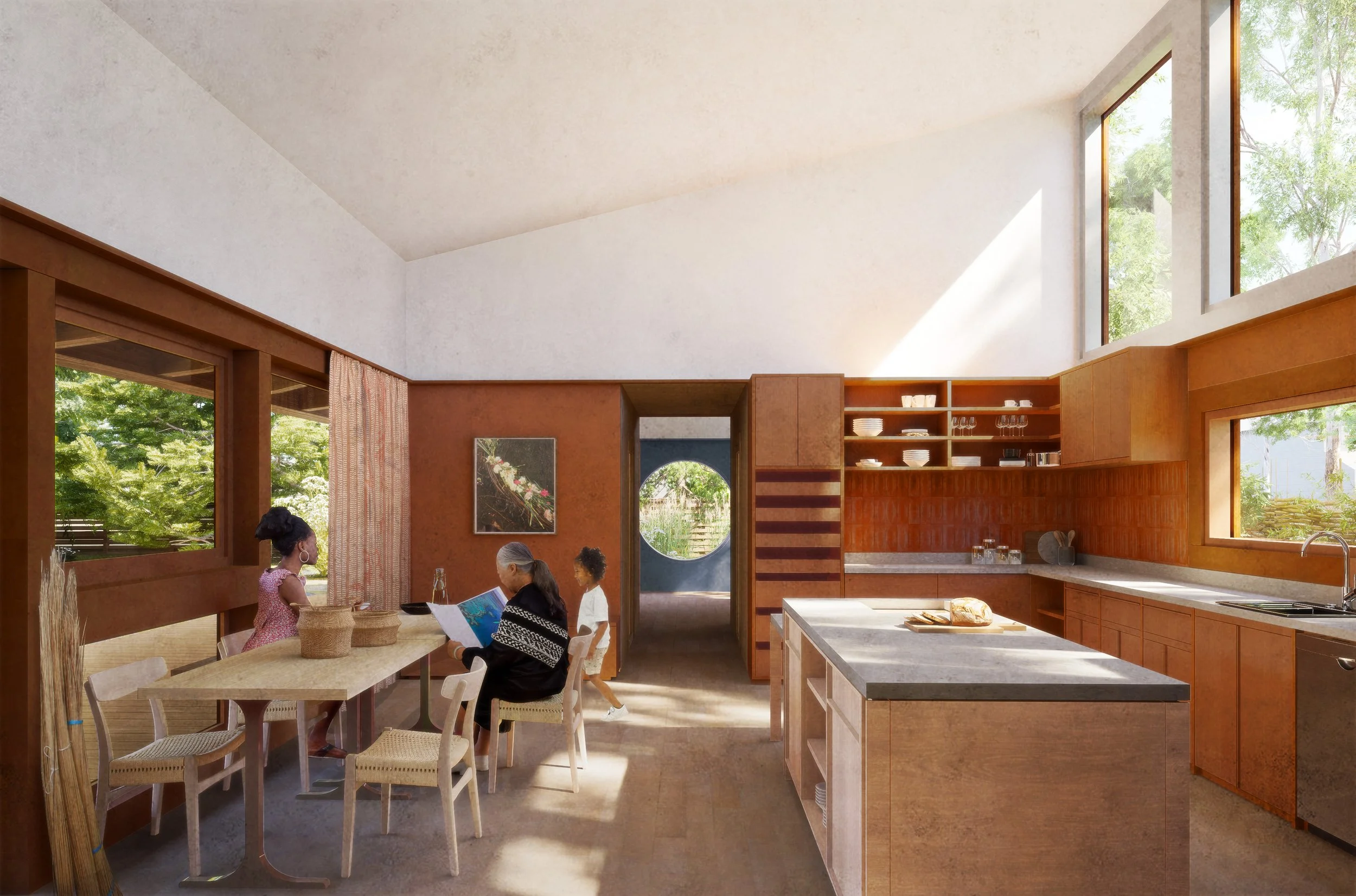 A Community Wellness structure will feature a sauna, outdoor sweat lodge, and soaking pool. The surrounding climate-resilient landscape will support Indigenous, Black, and inter-community cultural practices through native habitat restoration, organic culturally-responsive vegetable gardens, plant medicine gardens, a greenhouse, and a First Foods forest. Green Infrastructure elements will consist of rainwater catchment and irrigation systems, stormwater collection, and permeable pathways that protect local waterways. The grounds will also include an outdoor amphitheater and space dedicated for ceremony.
